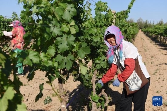 6月21日,在河北省懷來縣長城桑干酒莊葡萄種植基地,當(dāng)?shù)剞r(nóng)民在田間勞作。