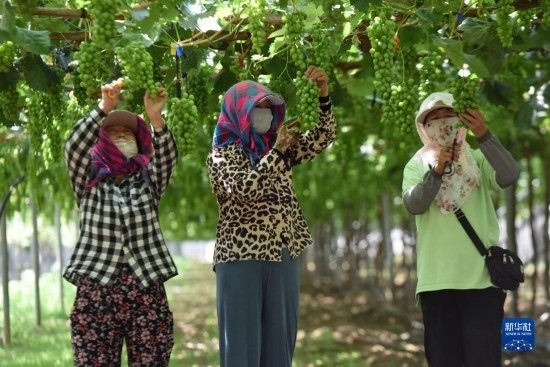 6月21日,在河北省懷來縣的豐禾葡萄基地,當(dāng)?shù)剞r(nóng)民在進(jìn)行葡萄管理。
