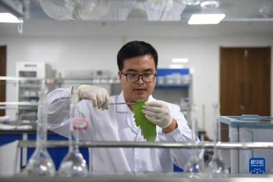6月21日,在位于河北省懷來縣的河北省葡萄產(chǎn)業(yè)技術(shù)研究院,來自天津農(nóng)學(xué)院的研究生韓亞奇正在分析葡萄葉的健康狀況。
