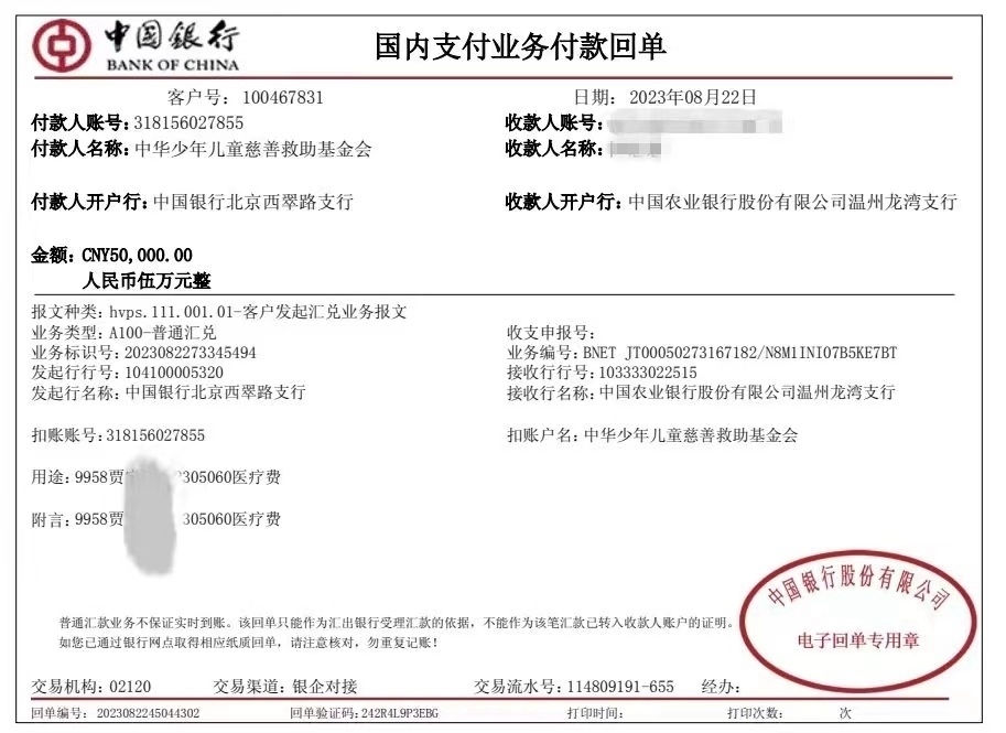 一位患者家屬提供給記者的銀行轉(zhuǎn)賬記錄顯示,8月22日的一張銀行的付款回單上,付款人名稱為:中華少年兒童慈善救助基金會,收款人名稱為患者家屬陳某某,單據(jù)上標(biāo)注的用途為某某某醫(yī)藥費等字樣。收款金額為5萬元。