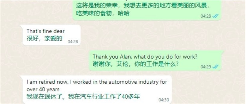 “通過(guò)對(duì)方發(fā)來(lái)的照片可以觀察他居住的環(huán)境、開(kāi)的車(chē)等等,判斷他有沒(méi)有錢(qián),沒(méi)有錢(qián)就直接丟掉不聊了。詐騙團(tuán)伙里的組長(zhǎng)、團(tuán)長(zhǎng)或者是其他騙到很多錢(qián)的人,也會(huì)分享自己聊天經(jīng)驗(yàn),告訴我們有哪些地方需要改進(jìn)。”