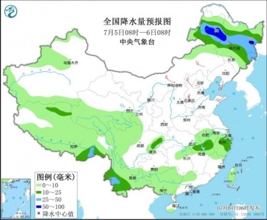 全國降水量預(yù)報圖(7月5日08時-6日08時)。圖片來源:中央氣象臺網(wǎng)站