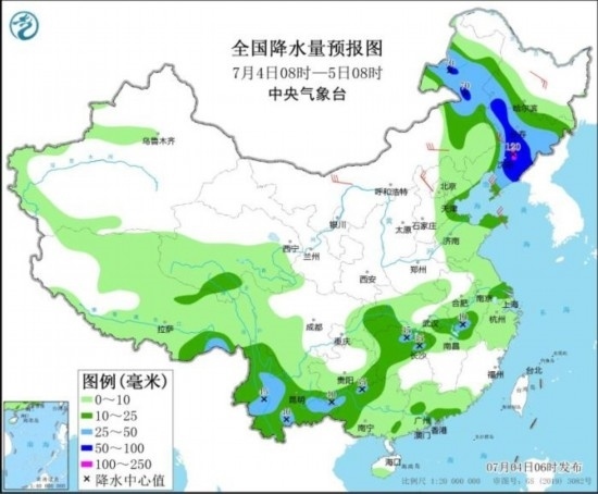 4日至5日,遼寧、吉林、黑龍江中南部、內(nèi)蒙古東北部等地將有大到暴雨、局地大暴雨。預(yù)計,7月4日08時至5日08時,內(nèi)蒙古東北部、黑龍江西南部、吉林、遼寧中東部、云南西部和南部等地部分地區(qū)有大到暴雨,其中,遼寧東北部等地局地有大暴雨(100~120毫米)。上述部分地區(qū)伴有短時強降水(最大小時降雨量20~50毫米,局地可超過60毫米),局地有雷暴大風(fēng)等強對流天氣。中央氣象臺7月4日06時繼續(xù)發(fā)布暴雨藍色預(yù)警。