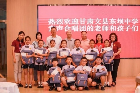 7月4日中午,在中國記協(xié)會(huì)客廳,文縣東壩童聲合唱團(tuán)的孩子們見到了他們熟悉的中國記協(xié)黨組書記、副主席劉思揚(yáng)爺爺。今年2月,劉思揚(yáng)爺爺專門來到文縣,走進(jìn)他們的排練廳,聆聽了他們即將在甘肅廣播電視總臺(tái)演出的曲目。他當(dāng)場說:“我被孩子們眼中的光深深地觸動(dòng)了。這是一種自信的、堅(jiān)毅的光。帶著這種光,無論你們將來走出大山,還是學(xué)成后回到山里建設(shè)家鄉(xiāng),這種自信和堅(jiān)毅的情愫都將伴隨你們終生?!苯裉旌⒆觽兌汲闪藙⑺紦P(yáng)爺爺?shù)男】腿恕敔斀o孩子們講述了什么是記者、什么是記協(xié),鼓勵(lì)孩子們好好學(xué)習(xí),將來報(bào)效祖國。劉爺爺還為每個(gè)孩子準(zhǔn)備了滿滿一個(gè)大書包的各種禮物。孩子們排著演出隊(duì)形,為中國記協(xié)的老師們唱出了《大山里的孩子》,還有那首剛剛學(xué)會(huì)的、走進(jìn)央視錄音棚的《童心里的中國》: