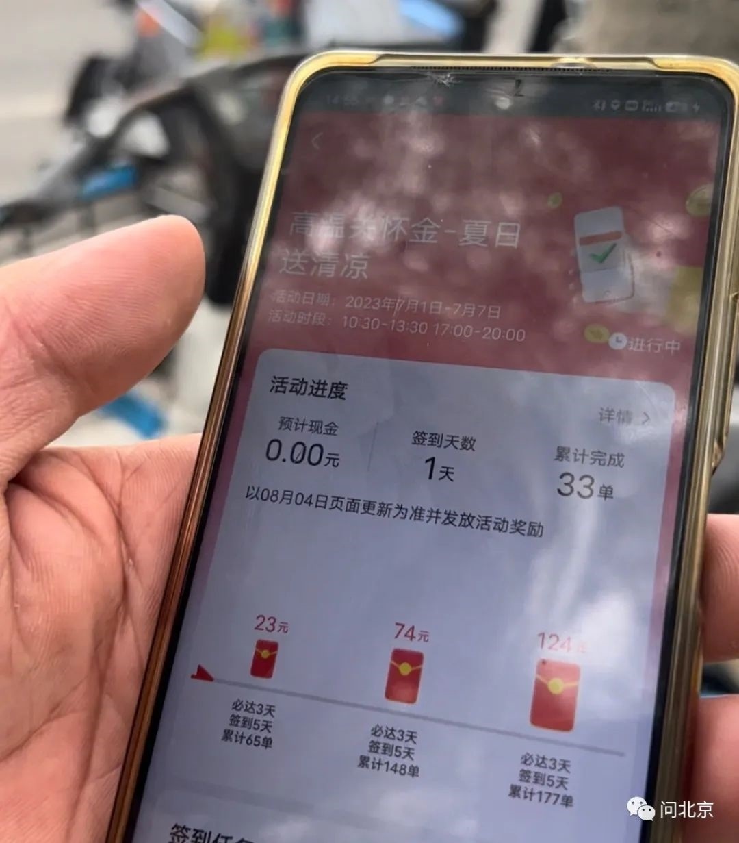 記者點進活動頁面看到,必達(dá)3天,簽到5天,累計65單可獎勵23元錢,累計148單可獎勵74元錢,最高獎勵是累積177單可獎勵124元。但是另一名外賣小哥告訴記者,所謂的高溫關(guān)懷金,只是另一種方式的沖單獎勵。