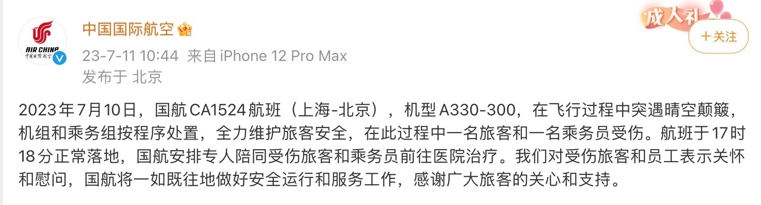 7月11日,中國國際航空在其官方微博發(fā)布通報:2023年7月10日,國航CA1524航班(上海-北京),機型A330-300,在飛行過程中突遇晴空顛簸,機組和乘務(wù)組按程序處置,全力維護旅客安全,在此過程中一名旅客和一名乘務(wù)員受傷。航班于17時18分正常落地,國航安排專人陪同受傷旅客和乘務(wù)員前往醫(yī)院治療。