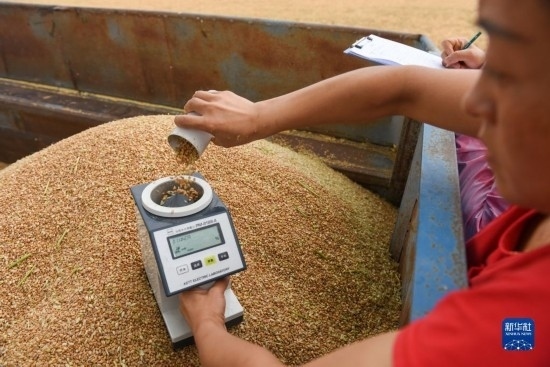 7月10日,在石嘴山市平羅縣姚伏鎮(zhèn),農業(yè)工作者對小麥進行水分測量。