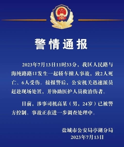 ·江蘇鹽城發(fā)生轎車撞人事故致2死6傷,涉事司機已被控制。