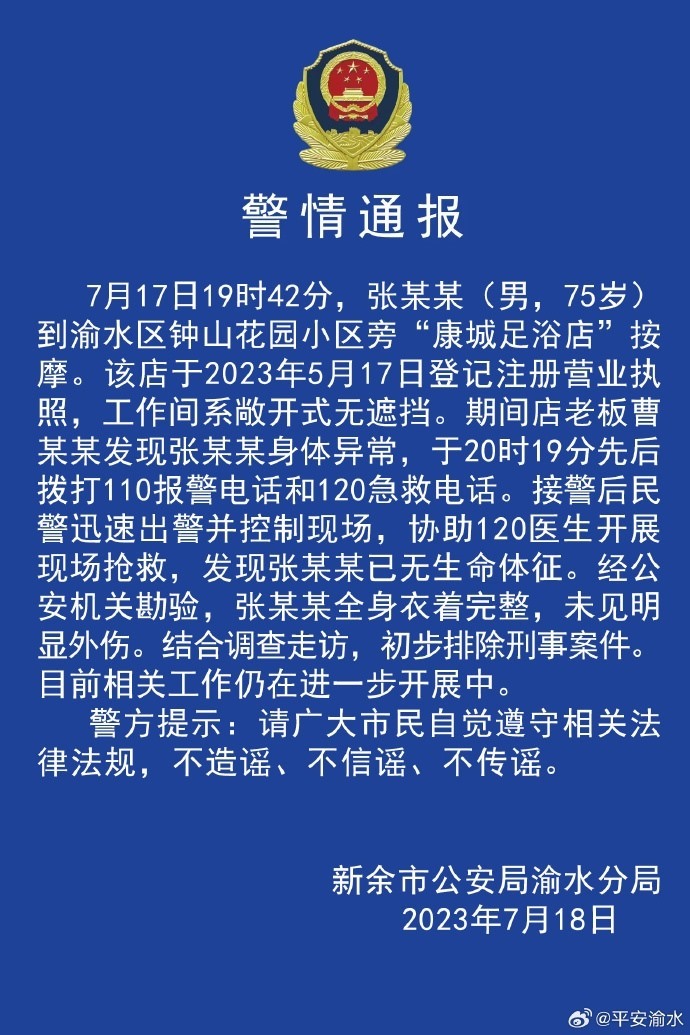 ·警方通報7旬男子按摩店內(nèi)死亡:其衣著完整未見明顯外傷,初步排除刑事案件。