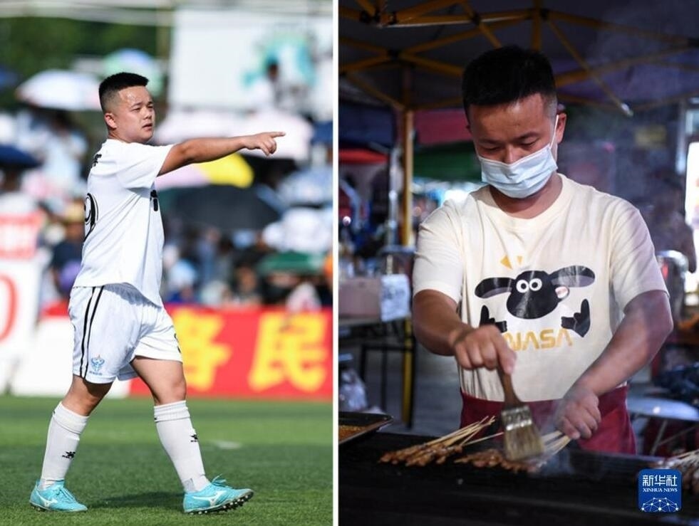 貴州“村超”球員的“雙面人生”。左圖為7月15日,六佰塘村足球隊球員楊宗維在比賽中組織進攻;右圖為7月16日,楊宗維在燒烤攤給客人烤肉串。