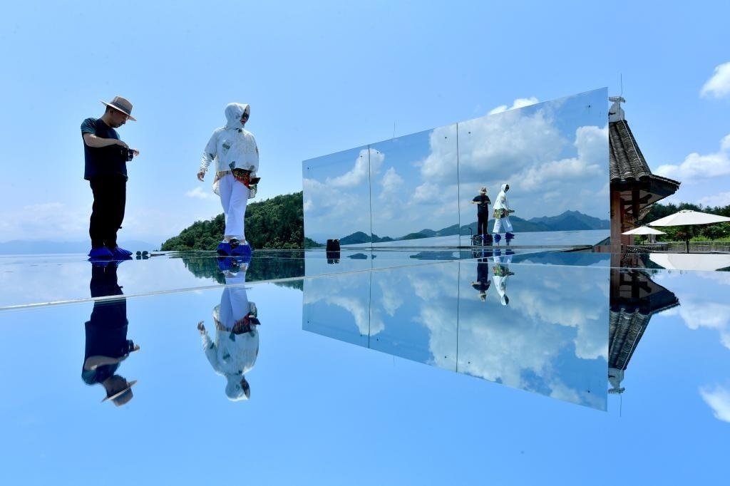 6月25日,游客在宣恩縣鑼圈巖村一處鄉(xiāng)村民宿的“天空之鏡”景點游玩。新華社發(fā)(宋文攝)