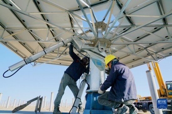 7月21日,在阿克塞千萬千瓦級可再生能源多能互補基地,工人在匯東新能源75萬千瓦光熱+項目建設(shè)現(xiàn)場安裝定日鏡。新華社發(fā)(馬曉偉 攝)