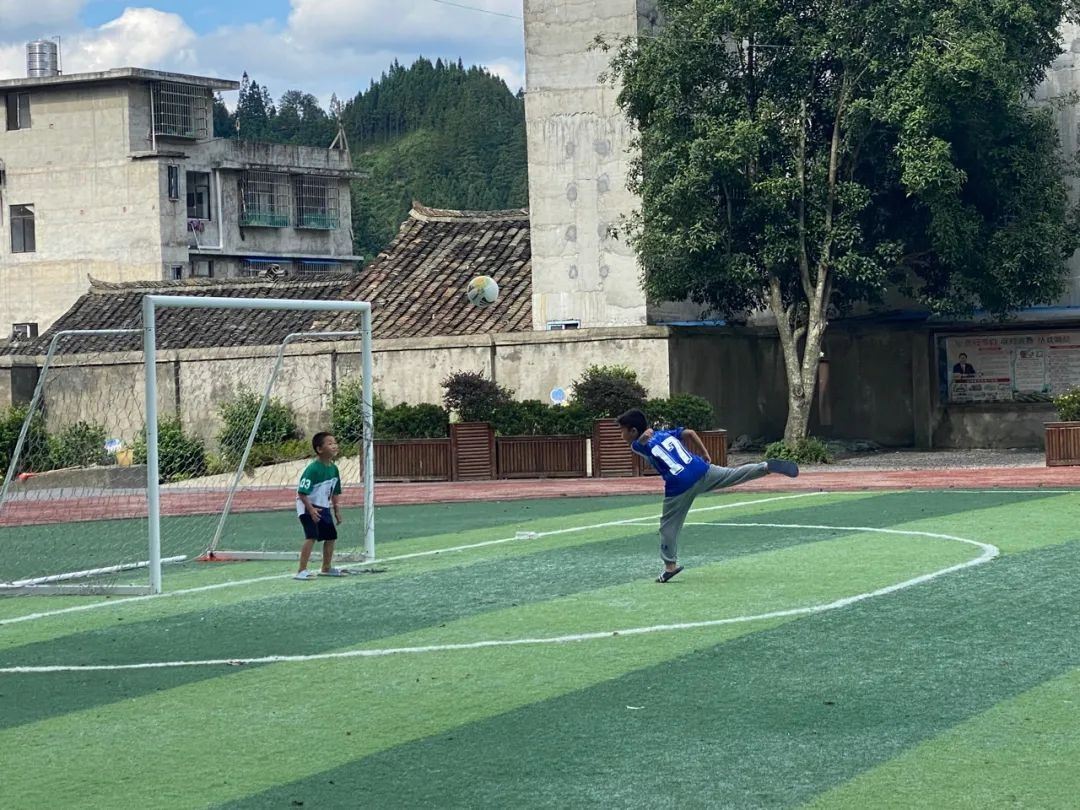 正值暑假,在榕江縣一所小學(xué)的足球場上,王同學(xué)和錢同學(xué)正在踢足球。今年七歲的王同學(xué)剛剛幼兒園畢業(yè),平時愛看足球,也愛踢足球,“長大以后,我也要踢‘村超’!”今年十二歲的錢同學(xué)則是小學(xué)足球校隊的成員,也常常看“村超”比賽,“希望以后能代表校隊拿到一個冠軍。”