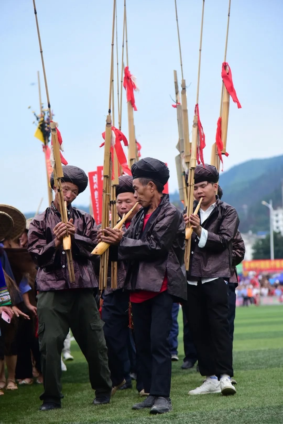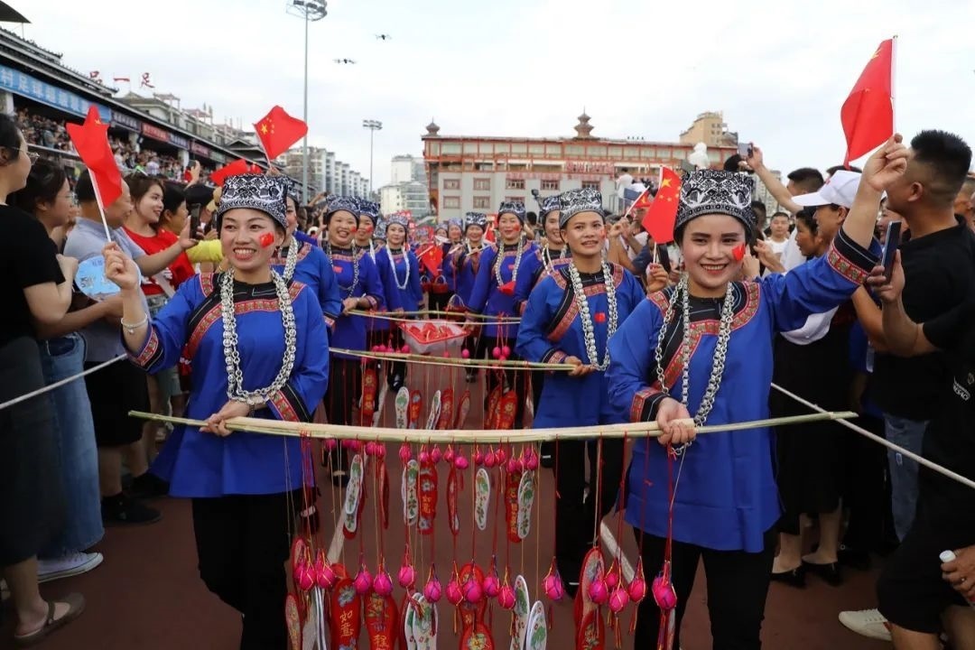 中場間隙,身著傳統(tǒng)服飾載歌載舞的拉拉隊走到綠茵場上,舞龍、吹蘆笙、唱侗歌……綠茵場秒變“民族大舞臺”。