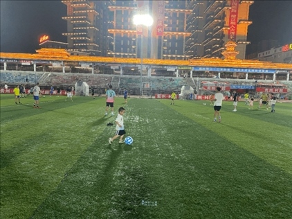 在比賽間隙和結(jié)束后,觀眾席上的孩子們會沖進球場,玩起傳球、盤帶和射門;工作日的晚上,“村超”體育場上,有很多踢球的身影,有中學(xué)足球隊的隊員,有八九歲的小學(xué)生,還有剛剛學(xué)會走路的小朋友。