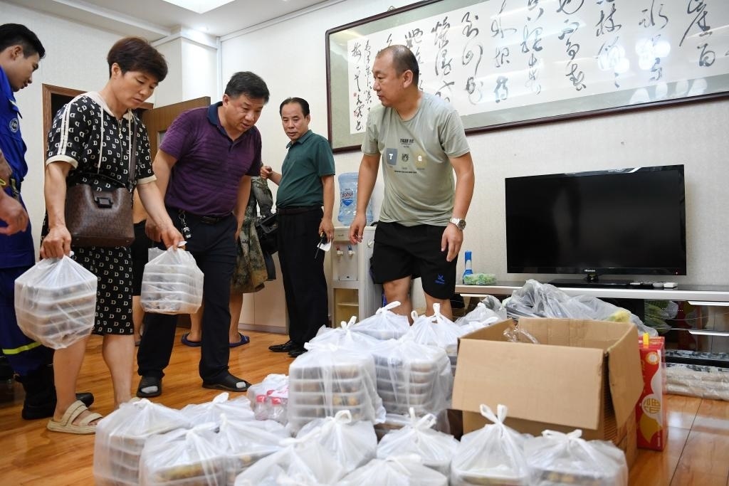 8月1日晚,河北省涿州市職業(yè)技術(shù)教育中心的工作人員正在運送飯菜,準備發(fā)放給安置群眾。新華社記者 牟宇 攝