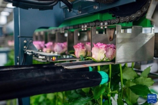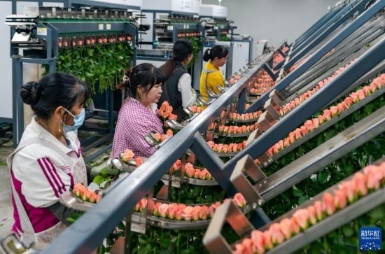 在云天化晉寧花卉產(chǎn)業(yè)現(xiàn)代化示范園內(nèi),花農(nóng)們將鮮切花自動(dòng)分揀流水線上分揀好的鮮花取下,準(zhǔn)備放入包裝流水線(7月12日攝)。新華社記者 陳欣波 攝