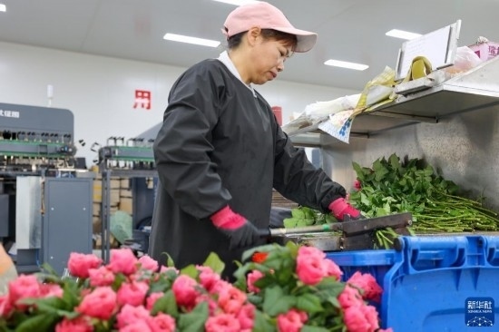 在云天化晉寧花卉產(chǎn)業(yè)現(xiàn)代化示范園內(nèi),一名花農(nóng)在對(duì)包裝流水線上的鮮花進(jìn)行包裝(7月12日攝)。新華社記者 崔文 攝
