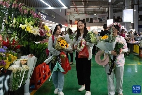 幾名外地游客在昆明斗南花卉市場(chǎng)內(nèi)購買鮮花(7月13日攝)。新華社記者 陳欣波 攝