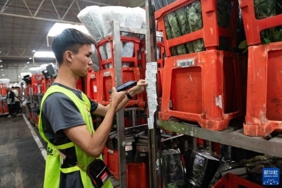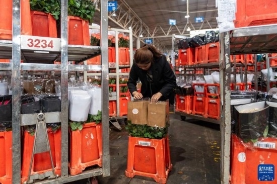 一名工作人員在昆明國際花卉拍賣交易中心內(nèi)對(duì)臺(tái)車上存放的鮮花進(jìn)行掃碼(7月13日攝)。新華社記者 陳欣波 攝