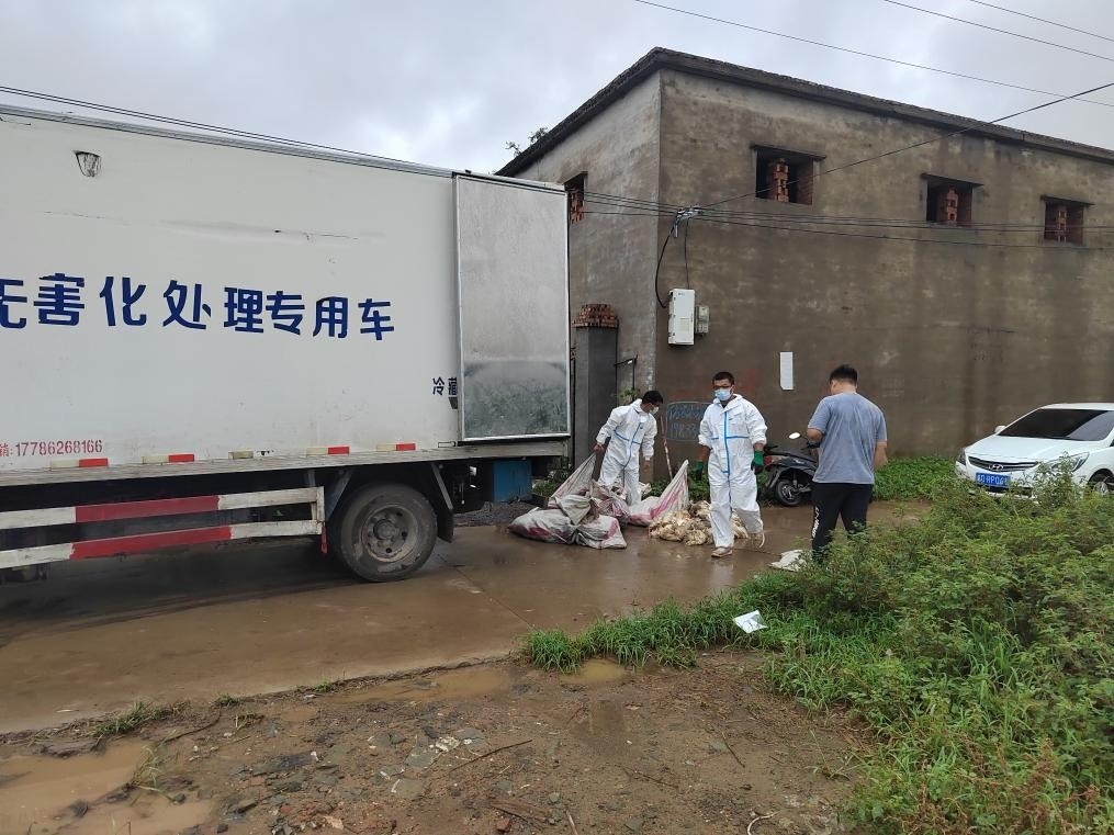 在邯鄲市雞澤縣雙塔鎮(zhèn)中申底村一家蛋雞養(yǎng)殖場(chǎng)內(nèi),縣農(nóng)業(yè)農(nóng)村局動(dòng)物衛(wèi)生監(jiān)督所負(fù)責(zé)人高仁鵬帶領(lǐng)消毒技術(shù)指導(dǎo)組成員對(duì)養(yǎng)殖場(chǎng)內(nèi)淹死的410只蛋雞進(jìn)行集中收集,通過(guò)專(zhuān)業(yè)車(chē)輛運(yùn)往病死畜禽無(wú)害化處理廠進(jìn)行專(zhuān)業(yè)處理。