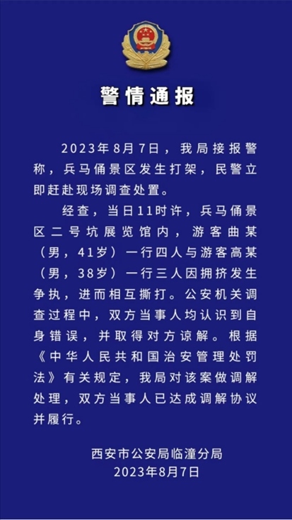·西安警方通報(bào)兵馬俑景區(qū)打架事件:雙方當(dāng)事人已達(dá)成調(diào)解協(xié)議。