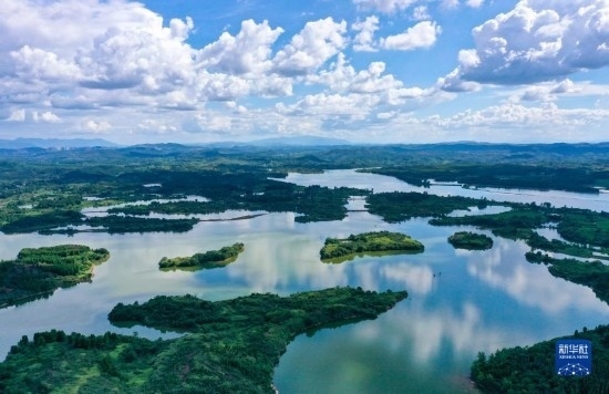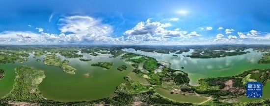 8月6日,湖南桂陽(yáng)舂陵國(guó)家濕地公園,綠水、濕地、藍(lán)天相映成趣,構(gòu)成一幅秀美的夏日生態(tài)畫(huà)卷(無(wú)人機(jī)全景照片)。