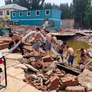 “大家一起用手攥住水管往上抬啊,來(lái),一起用勁兒,一……二!一……二!”