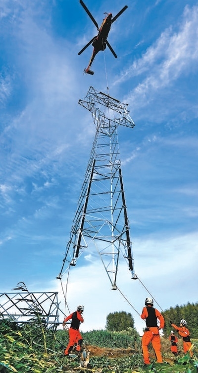 8月9日,國家電網(wǎng)公司調配直升機支援黑龍江電力恢復工作。圖為直升機在牡丹江海林110千伏海長線搶修現(xiàn)場整塔吊裝作業(yè)中。方 圓 張恩全攝影報道