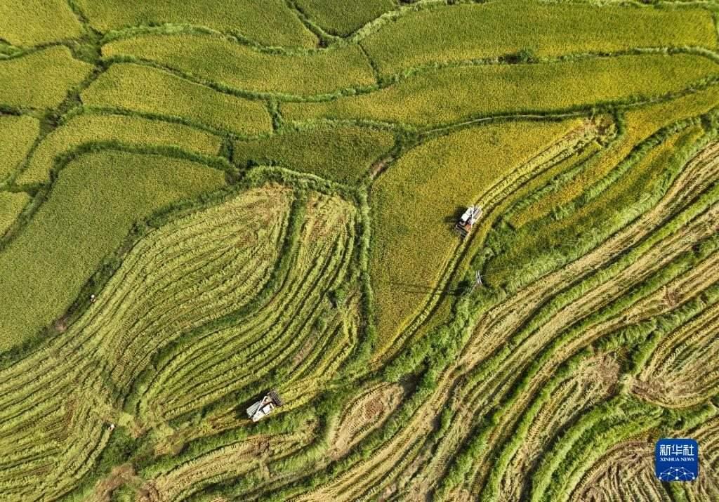 近日,四川東部廣安市近200萬畝水稻進入成熟收獲期,農(nóng)民在田間忙碌,收獲水稻。