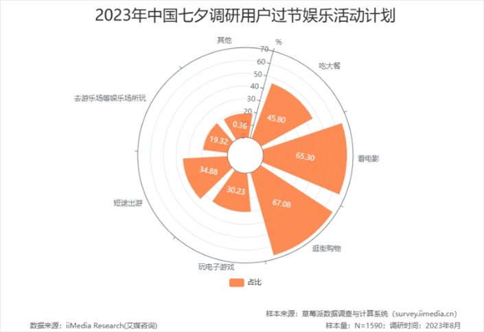 今年七夕恰逢工作日,大多數(shù)人選擇下班后再相聚。“中國七夕節(jié)日消費(fèi)行為大數(shù)據(jù)調(diào)查”顯示,2023年消費(fèi)者過節(jié)的娛樂活動(dòng)計(jì)劃TOP3分別為:逛街購物、看電影、吃大餐。