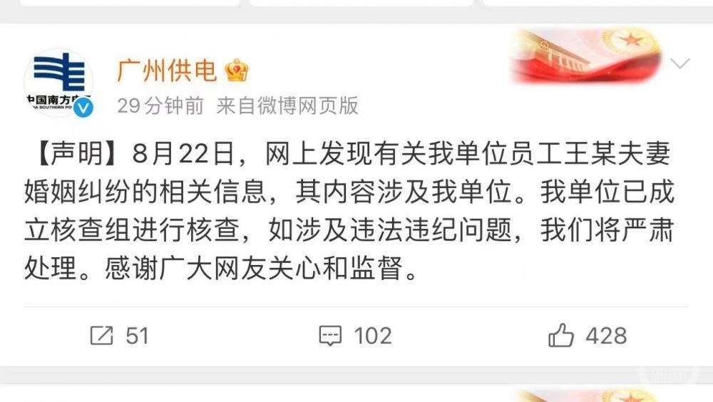 8月22日,南方電網(wǎng)廣州供電局職工王某斌被妻子舉報一事引發(fā)關注后,廣州供電局當日晚間發(fā)布聲明,表示已成立核查組進行調(diào)查。