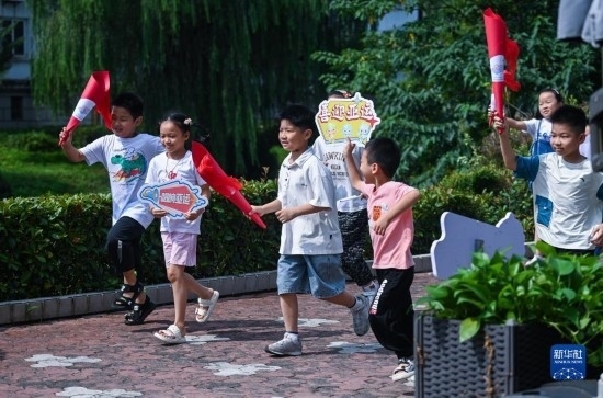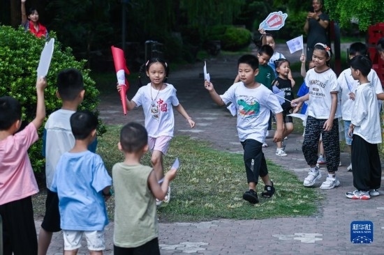8月24日,在湖州市龍泉街道白魚潭社區(qū),孩子們拿著自己制作的火炬,參與趣味火炬?zhèn)鬟f活動(dòng)。