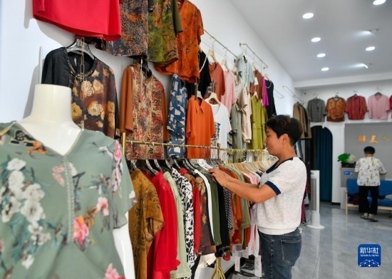 8月25日,前來趕集的村民在大集上挑選衣服。