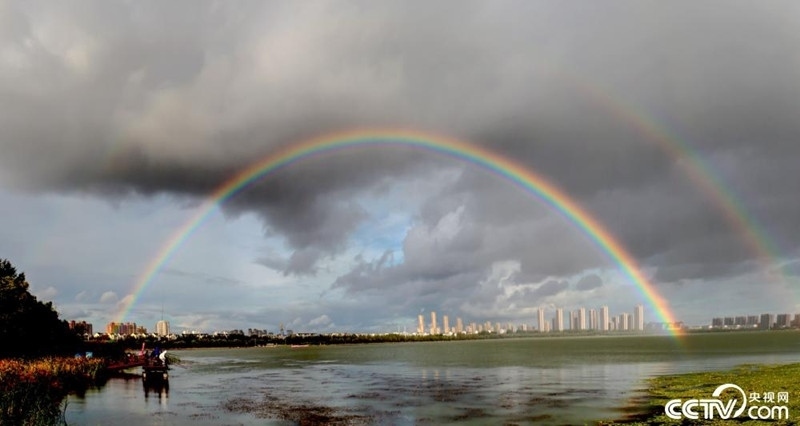 黑龍江大慶,雨后出現(xiàn)雙彩虹,絢麗的彩虹橫跨濱州湖。