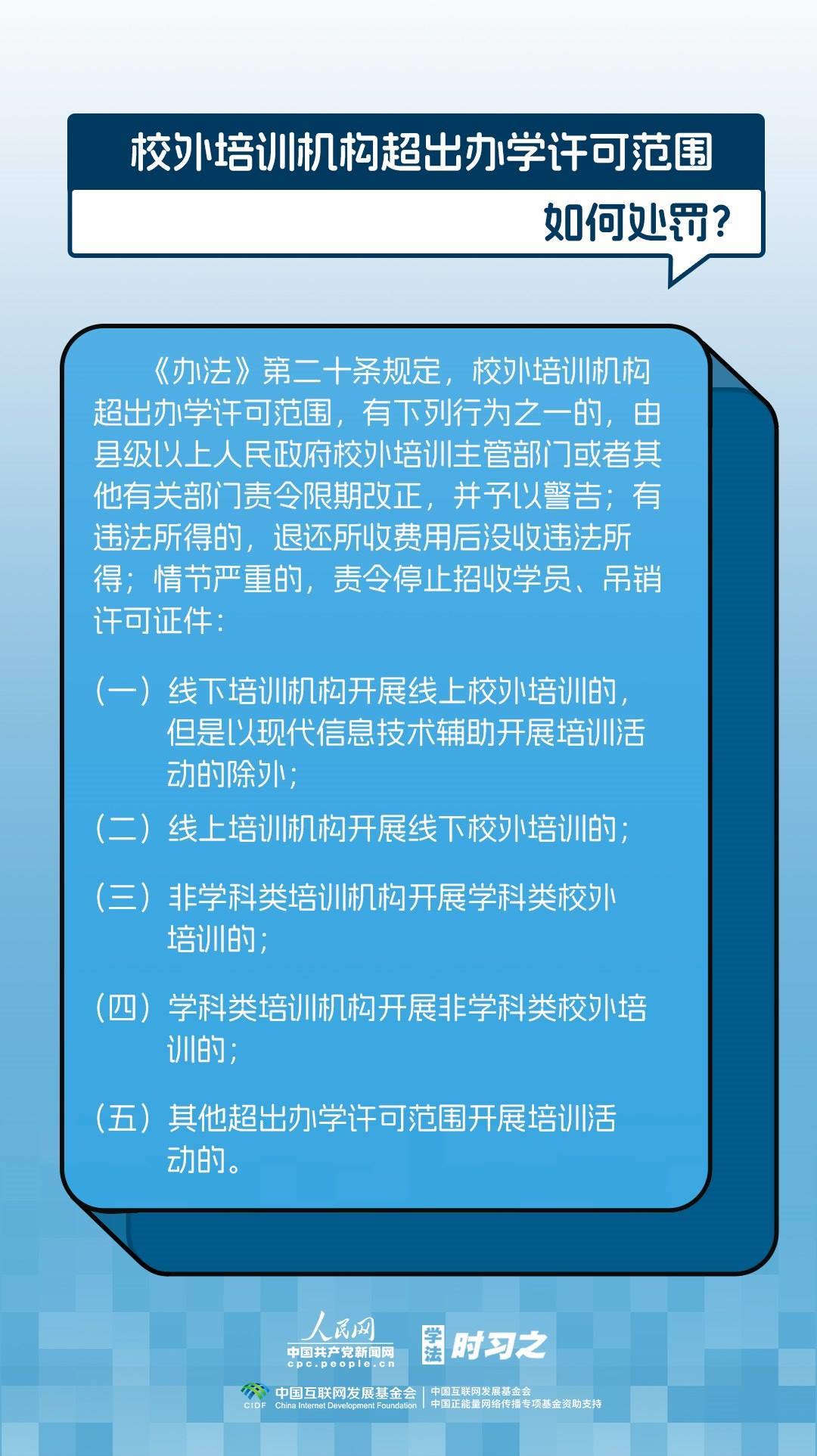 《校外培訓行政處罰暫行辦法》(以下簡稱《辦法》)將于2023年10月15日起施行?!掇k法》提出了校外培訓行政處罰總體要求。規(guī)定適用對象為面向社會招收3周歲以上學齡前兒童、中小學生,違法開展校外培訓的自然人、法人或者其他組織。要求校外培訓行政處罰應當遵循公正、公開的原則,堅持處罰與教育相結合,引導自然人、法人或者其他組織自覺守法,共同抵制校外培訓違法行為,營造有利于學生成長成才的良好環(huán)境。