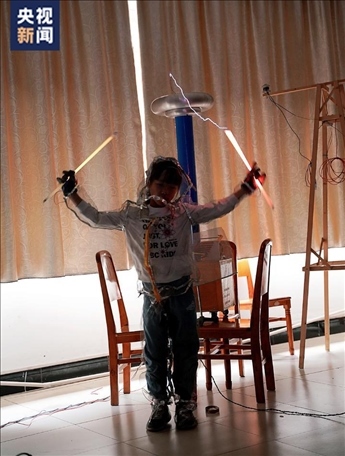 實(shí)驗(yàn)展示過程中,屈老師手持熒光燈管,逐漸靠近特斯拉線圈,轉(zhuǎn)瞬之間,一道電流好像穿過他的身體,形成絢麗的火花,現(xiàn)場(chǎng)畫面仿佛置身科幻電影。
