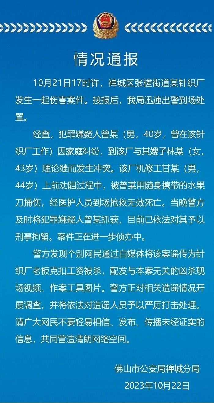 ·廣東警方辟謠網(wǎng)傳老板克扣工資被殺:男子因家庭糾紛與嫂子起沖突,該廠機(jī)修工勸阻中被捅傷致死。