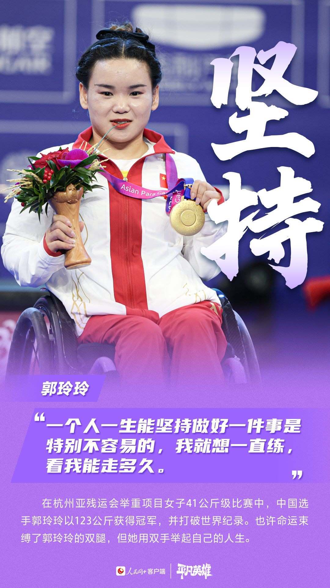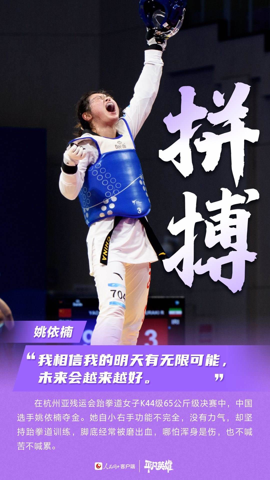 一張張寫滿堅韌的臉、一個個頑強(qiáng)拼搏的身軀,定格了許多震撼人心的瞬間。在杭州第4屆亞殘運(yùn)會的賽場上,中國運(yùn)動員用不服輸、不放棄的精神,告訴我們“沒有什么不可能”。致敬每一位運(yùn)動員。