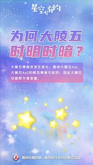 新華社南京11月4日電(記者王玨玢、邱冰清)11月的夜晚,東北方向的夜空之中閃爍著“一顆”時明時暗的星星。每隔兩三天,它的亮度就會經(jīng)歷一輪變化,周而復(fù)始,就好像會“眨眼”一樣。這就是著名的變星:大陵五。變星是怎么回事?大陵五為什么會“眨眼”?天文科普專家為您揭秘。