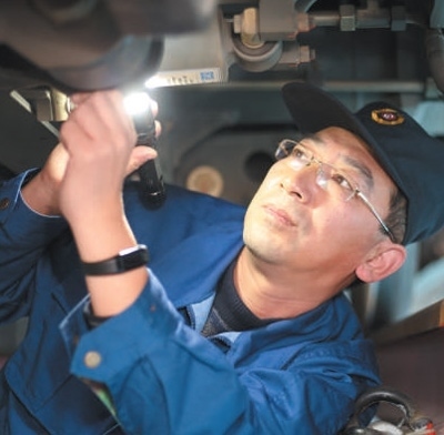 時而膝蓋微弓,腰部略彎;時而敲敲打打,上前細嗅……只見劉波進車廂、鉆車底、登車頂,對列車逐一進行檢查,不一會兒,動車隱患就被及時發(fā)現(xiàn)并排除。