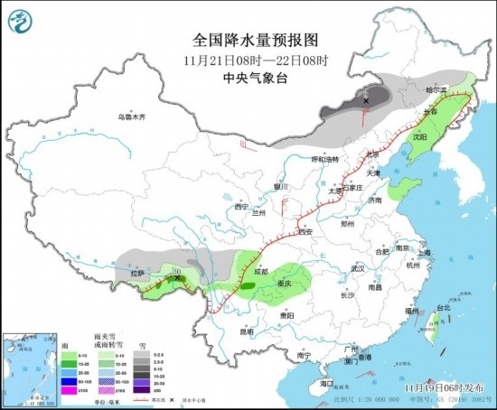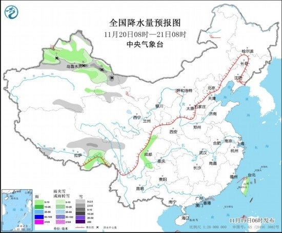 11月19日08時(shí)至20日08時(shí),新疆北部和伊犁河谷、黑龍江東部、吉林東部等地部分地區(qū)有小雪或雨夾雪,其中,新疆北部部分地區(qū)有中到大雪,局地暴雪(10~12毫米)。新疆北部、西藏東南部、四川南部、云南西部等地部分地區(qū)有小雨。內(nèi)蒙古中部和東部、黑龍江東部、遼寧東部等地部分地區(qū)有4~5級風(fēng)(見圖2)。