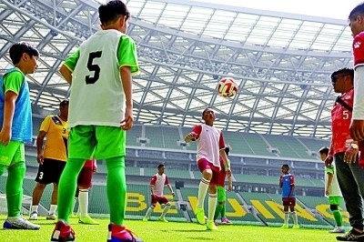 來(lái)自青海玉樹(shù)的40名藏族青少年參加“青海玉樹(shù)藏族青少年北京行”公益活動(dòng),與國(guó)安少年足球隊(duì)交流。新華社發(fā)