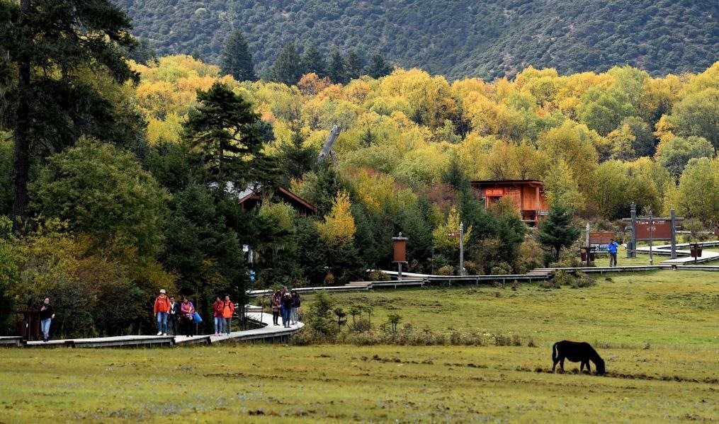 游人在云南迪慶州普達(dá)措景區(qū)里游覽。新華社記者 藺以光 攝