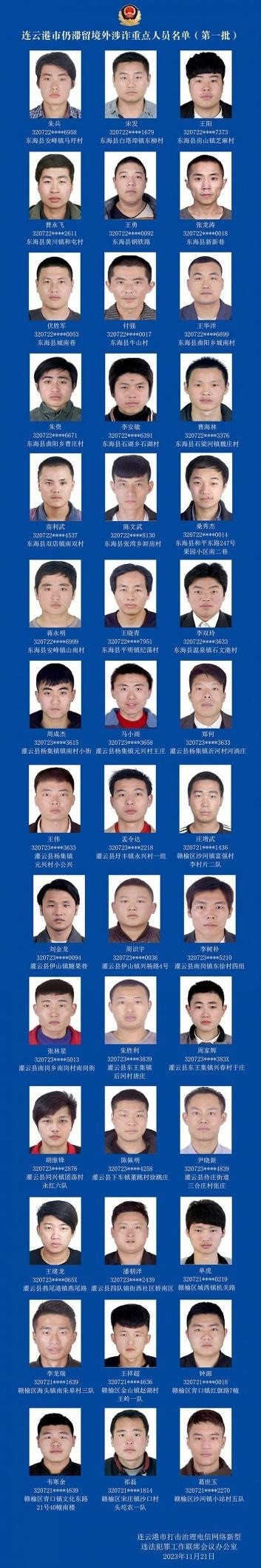 ·江蘇連云港警方發(fā)布首批42名非法滯留境外涉詐重點人員名單,要求滯留人員主動于2023年12月20日前通過正規(guī)渠道入境回國,并在入境前向戶籍地派出所報備。對于拒不回國投案自首的,司法機關將依法嚴懲。