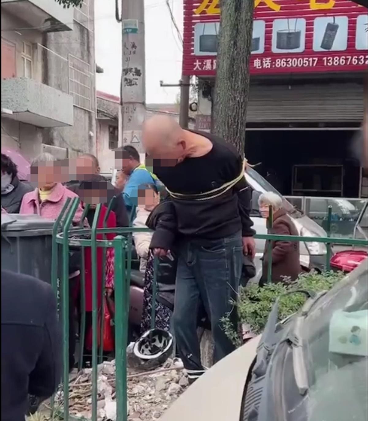 ·浙江溫嶺一男子疑偷錢遭綁樹上示眾扇耳光,知情人稱其已被派出所帶走。