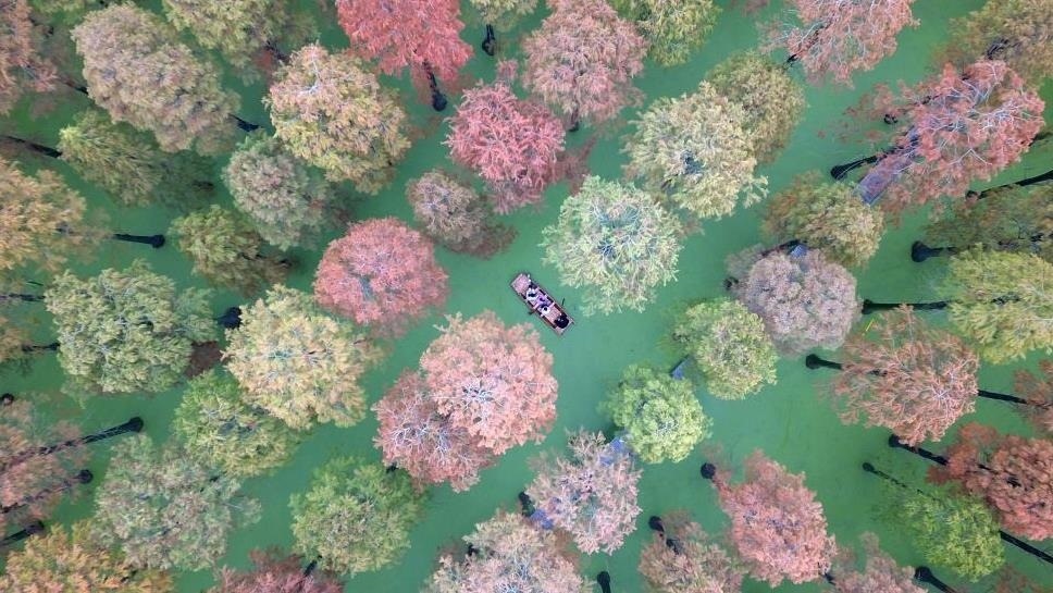 江蘇揚州,游客在淥洋湖濕地公園的“水上森林”游玩。初冬時節(jié)的“水上森林”層林盡染,色彩斑斕,美景如畫。