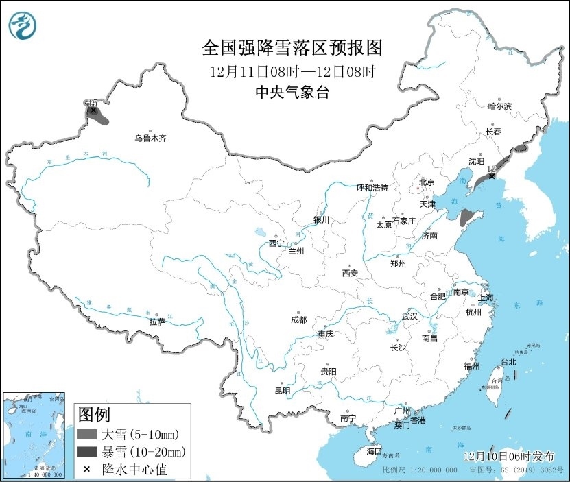 預計12月11日08時至12月12日08時,山東半島北部、遼寧東部、吉林東部及新疆伊犁河谷等地部分地區(qū)有大雪,其中,遼寧東部、新疆伊犁河谷等地局地有暴雪(10~15毫米)。上述部分地區(qū)新增積雪深度4~8厘米,局地可達10厘米以上。