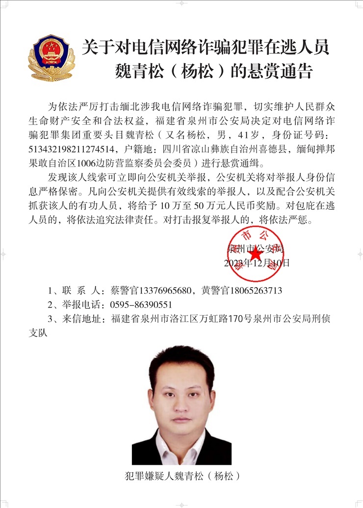 為依法嚴厲打擊緬北涉我電信網絡詐騙犯罪,切實維護人民群眾生命財產安全和合法權益,遼寧省大連市公安局決定對白所成、白應蒼(又名李云晨)、白應蘭(又名李夢娜)進行公開懸賞通緝;福建省泉州市公安局決定對魏懷仁、魏榕(又名陳榕)、魏青松(又名楊松)進行公開懸賞通緝;福建省龍巖市公安局決定對劉正祥、劉積光(又名李華光)、劉正茂進行公開懸賞通緝;重慶市公安局決定對徐老發(fā)(又名徐發(fā)啟)進行公開懸賞通緝。