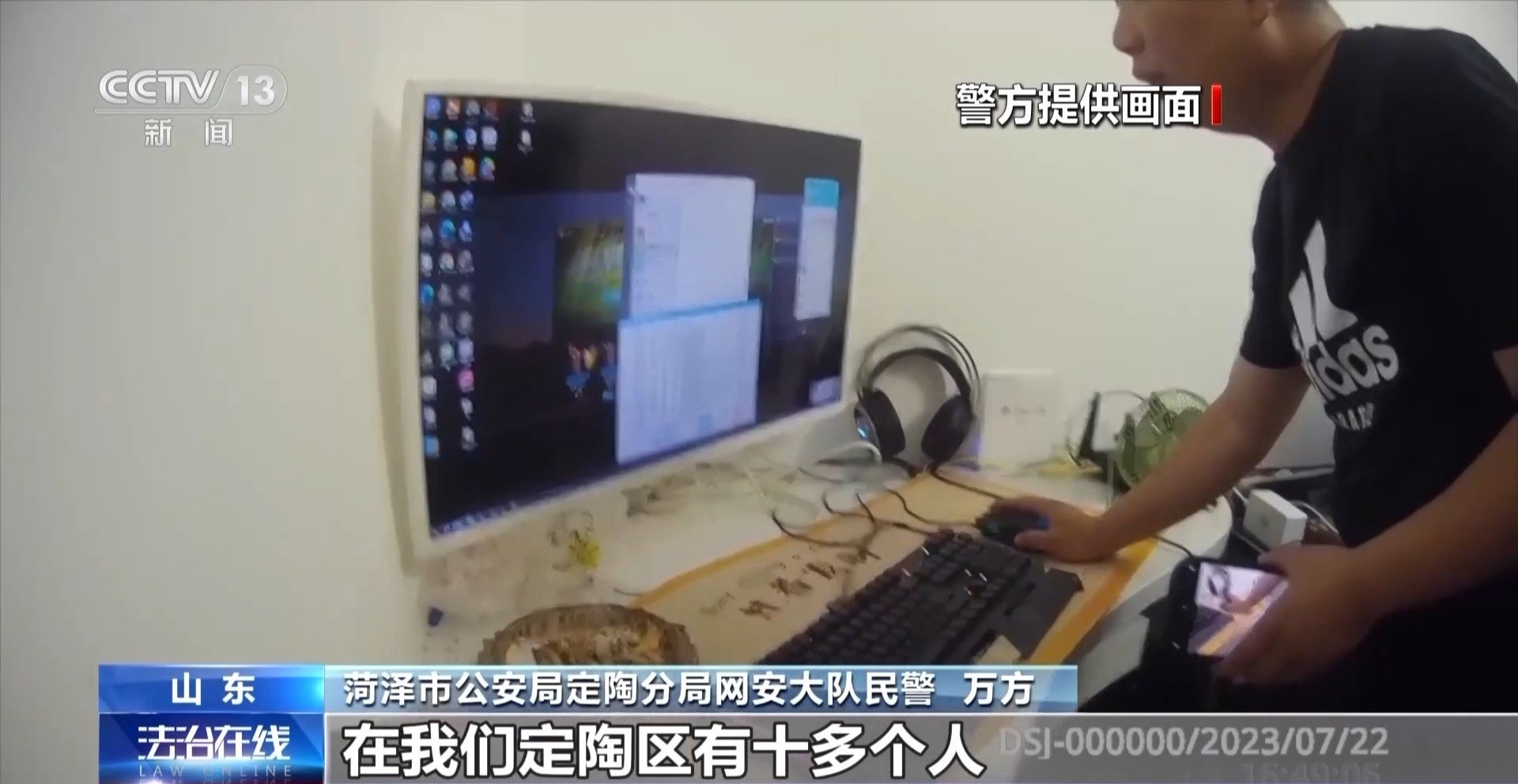 菏澤市公安局定陶分局網(wǎng)安大隊(duì)民警 萬(wàn)方:打開(kāi)門(mén)之后,當(dāng)時(shí)非常吃驚,很多部手機(jī)同時(shí)在批量開(kāi)著,還有很多充電器,批量充電的設(shè)備,他們?cè)谀抢锛茉O(shè)了一個(gè)工作室,放了三臺(tái)電腦。